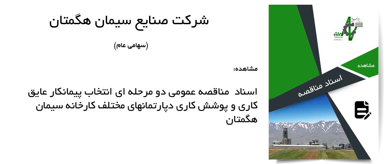 شرکت سیمان هگمتان در نظر دارد انجام عملیات عایق کاری و پوشش کاری در مناطق مختلف کارخانه خود را مطابق شرایط مندرج در اسناد مناقصه، از طریق برگزاری مناقصه عمومی دو مرحله ای به پیمانکار واجد شرایط واگذار نماید.  علاقمندان جهت دریافت اسناد مناقصه می توانند از تاریخ ۱۲/ ۰۷ /۱۴۰۴  تا ۲۰ / ۰۷ /۱۴۰۴ به سایت www.HegmatanCement.com مراجعه نمایند.